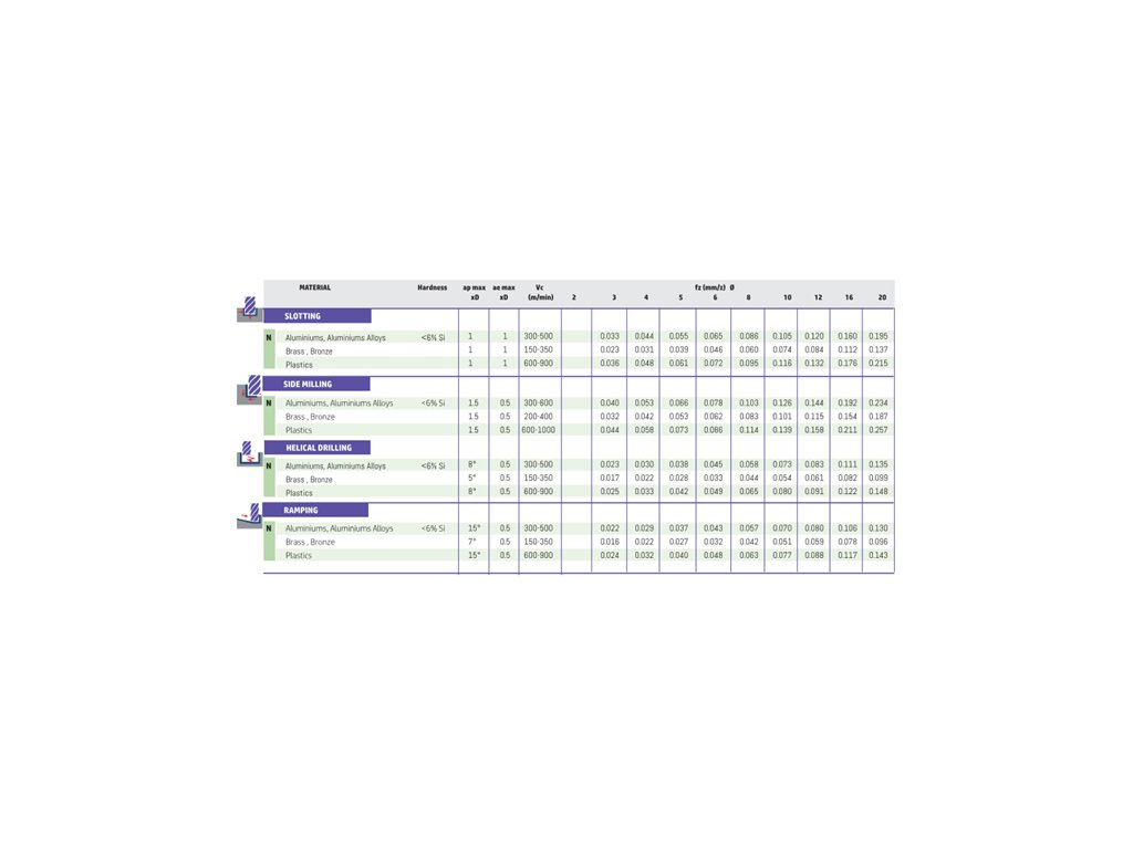 Geometrie 39/40/41°, odlehčení, nestejná zubová rozteč, stopka válcová, mikro rohový rádius, možnost šroubovicové interpolace, zajíždění po rampě, trochoidní frézování, maximální produktivita. Vnitřní chlazení v kombinaci s proměnnou geometrií zlepšuje odvod špon a umožňuje větší posuvy i řeznou rychlost a zkracuje strojní časy.