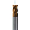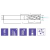 Geometrie 38°, nesouměrné břity, odlehčení, stopka válcová, rohové sražení, houževnatý povlak proti vyštípnutí nástroje. Středové chlazení napomáhá rychlejšímu odvodu tepla (špony) od nástroje a tím se prodlužuje životnost nástroje při obrábění obtížněji obrobitelných materiálů. Fréza umí drážkovat, obvodově frézovat, zajíždět po rampě, trochoidní frézování nebo šroubovicovou interpolaci.
