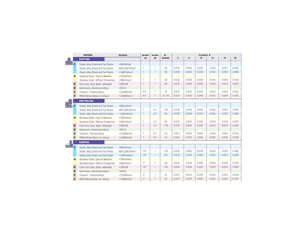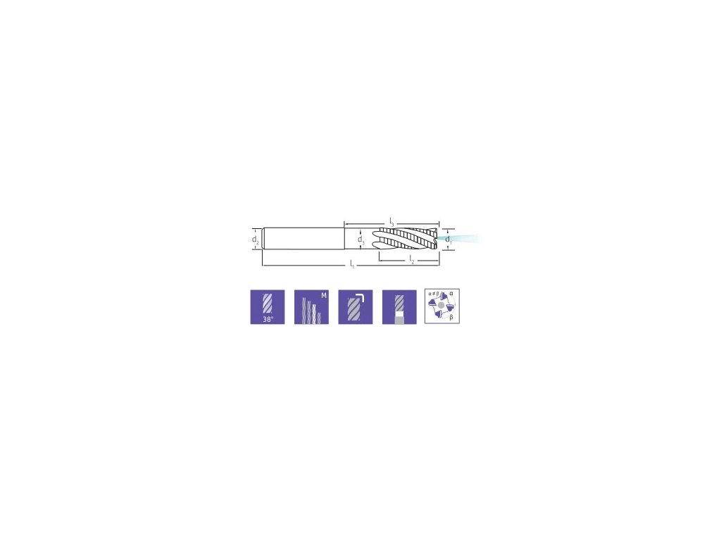 Geometrie 38°, nesouměrné břity, stopka weldon, rohové sražení, houževnatý povlak proti vyštípnutí nástroje. Středové chlazení napomáhá rychlejšímu odvodu tepla (špony) od nástroje a tím se prodlužuje životnost nástroje při obrábění obtížněji obrobitelných materiálů. Fréza umí drážkovat, obvodově frézovat, zajíždět po rampě, trochoidní frézování nebo šroubovicovou interpolaci.