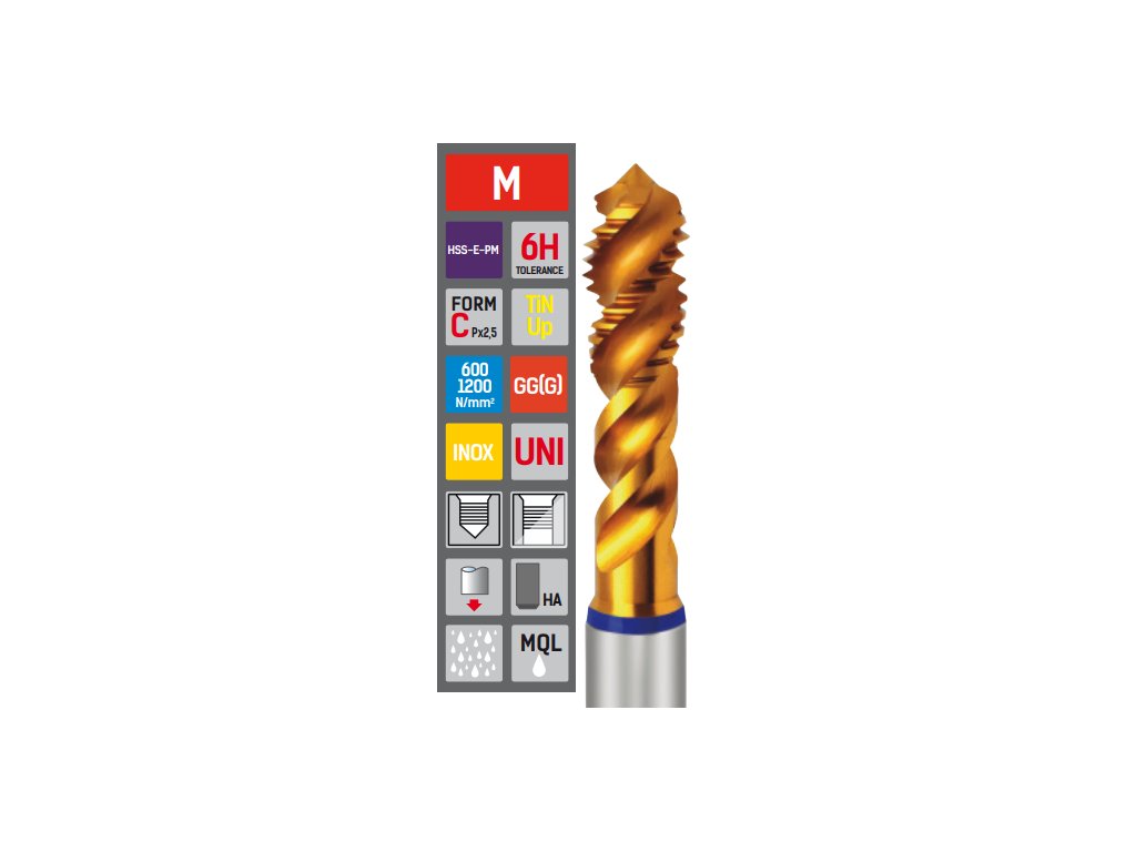 Univerzální závitník z materiálu HSSE PM pro CNC stroje je vhodný pro řezání závitů v nerez ocelích, litinách, ocelích včetně nástrojových, ale i neželezných materiálech jako např. slitiny hliníku, Ampca atd. Řezná rychlost dle materiálu, nerez 8-12m/min, ocel 8-22m/min, neželezné 10-25m/min