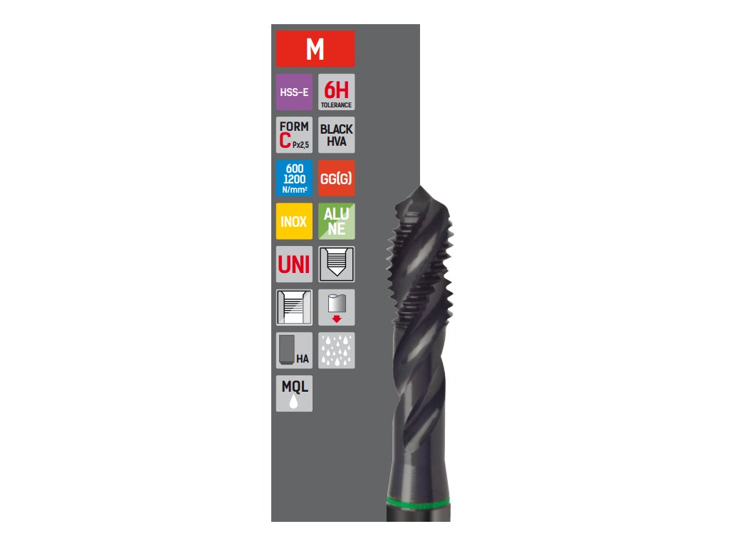 Univerzální závitník z materiálu HSSE pro CNC i klasické stroje je vhodný pro řezání závitů v nerez ocelích, litinách, ocelích, ale i neželezných materiálech jako např. slitiny hliníku, atd. Řezná rychlost dle materiálu, nerez 6-12m/min, ocel 6-20m/min, neželezné 10-20m/min